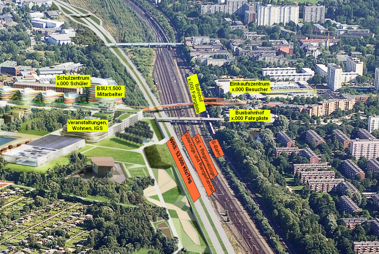 2. Die geplante Ausfahrt führt Tausende LKW entweder mitten in Tempo-30-Zonen (Schulen und Altenheime Rotenhäuser Str., Wohnungen Thielenstr.) oder bei deren Sperrung in einer Spirale mitten durch den Stadtteil. 3. Nur 1/3 der WRS (im igs-Gelände) wird zurück gebaut. Für die übrigen Abschnitte gibt es weder ein Konzept noch vorhandene Finanzmittel. Bleibt da eine neue Brache? 4. Mit der Verlagerung der Straße werden